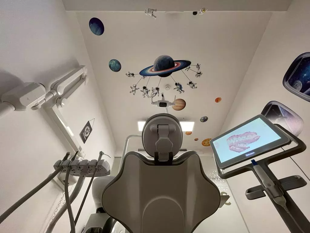 En una superficie de más de 130 m2 distribuidos en una amplia sala de espera con pantalla de entretenimiento, así como una zona infantil (CASA CON COCINA Y JUGUETES) para facilitarles a los peques el tiempo de espera. Amplia Recepción. Sala de esterilización donde contamos con todos los procesos necesarios para realizar un riguroso proceso de doble higienizado con elementos químicos para pasar posteriormente por una limpieza jabonosa para luego ser secado, embolsado y posteriormente esterilizado en autoclave. Pantallas de tv en los boxes para mostrar los tratamientos y las simulaciones virtuales, así como los diseños de sonrisa. 3 boxes dotados todos ellos con la más moderna tecnología de cámaras intraorales rayos X y escáner intraoral.